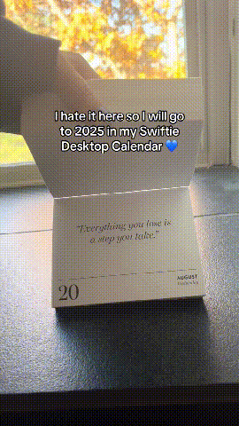 This desktop calendar is 4 x 3 inches with an attached pop-out kickstand. It's the perfect neutral desk accessory for the sentimental Swiftie. This calendar runs from January 1, 2025 through December 31, 2025.